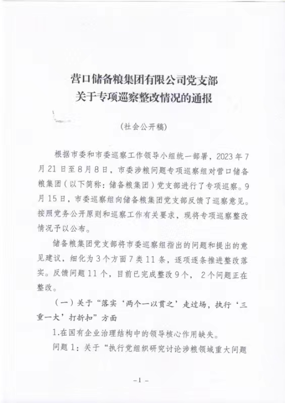 營(yíng)口儲(chǔ)備糧集團(tuán)有限公司黨支部關(guān)于專(zhuān)項(xiàng)巡察整改情況的通報(bào)